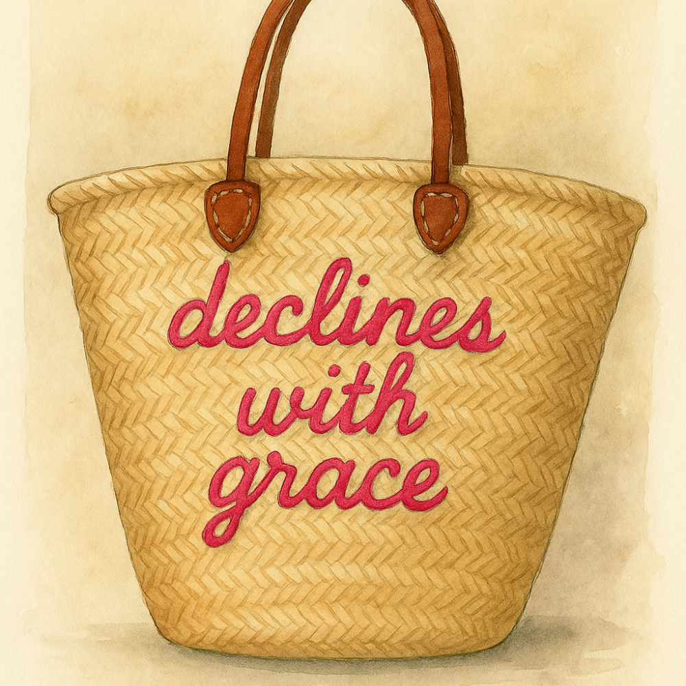 Kitty Badminton found these straw bags in a tiny stall in Marrakech—the sort of place reached only by following perfumed alleyways and the sound of distant laughter. She bought them in a whirlwind (Kitty never strolls through a market; she collects it), and had each one finished with a sturdy leather handle “for practicality,” which in Kitty-speak means more room for mischief.